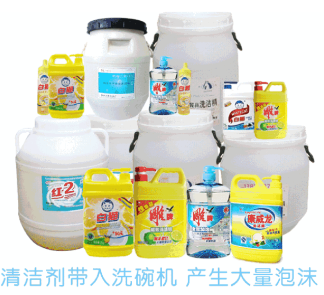 洗碗液是強堿性的,里面沒有表面活性劑,所以不容易產生泡沫。而催干劑功能是要破壞水分子的表面張力,所以有少量的表面活性劑,好的催干劑是具備抑制泡沫的功能。但不排除有些供應商的產品抑泡功能過弱,導致泡沫增加。建議尋找合作伙伴時,盡量找有資質的清潔劑服務商。